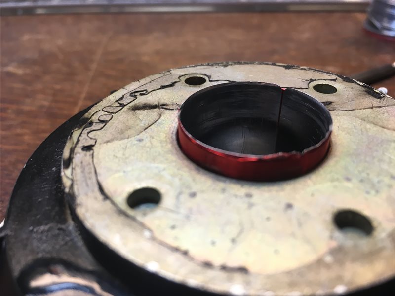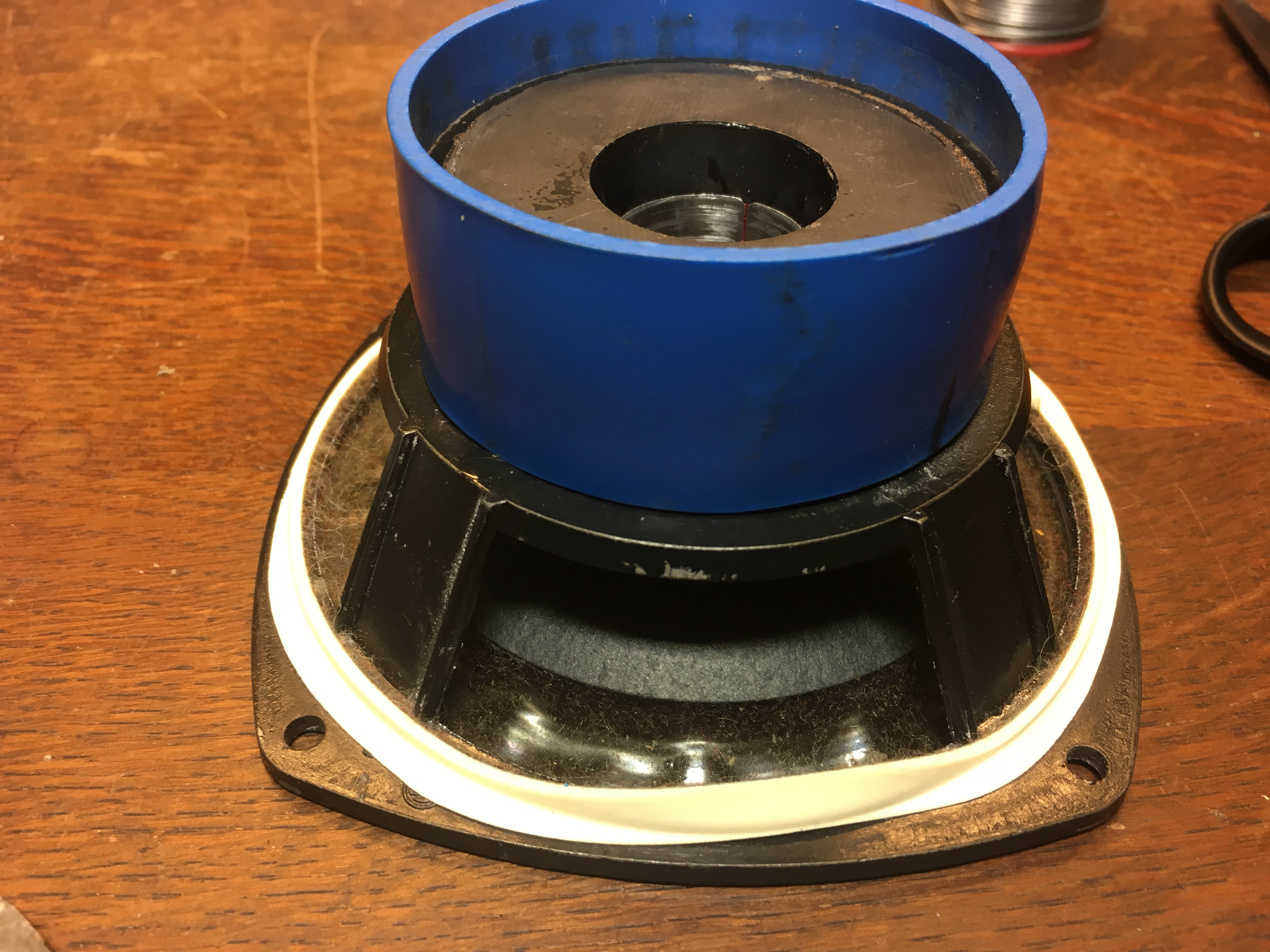 We took a tube that had a too large diameter. We sliced a ring (using a miter saw applying only light pressure) of about 4mm high. We made the ring fit tightly buy removing a piece of the ring and bending it tightly securing it with ducktape. We made sure is was even or a bit below with the magnet attachment surface of the speaker frame