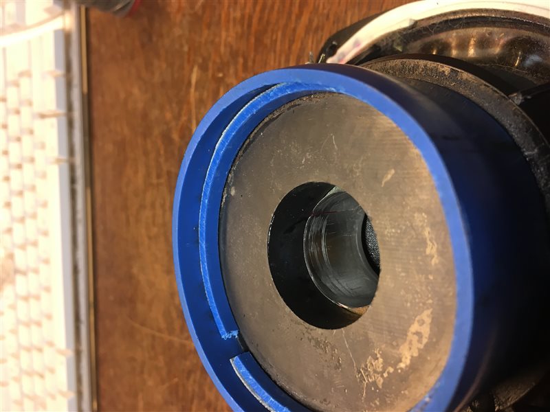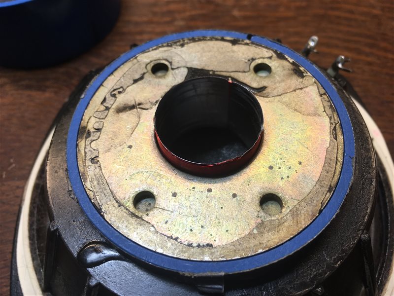 At this point it turned out that the voice coil was stuck. However, by gently wrenching the yoke using a small screw driver, we eventually found a position where the voice coil was moving freely. Then the seams were filled with epoxy to fix that position of the yoke on the magnet.