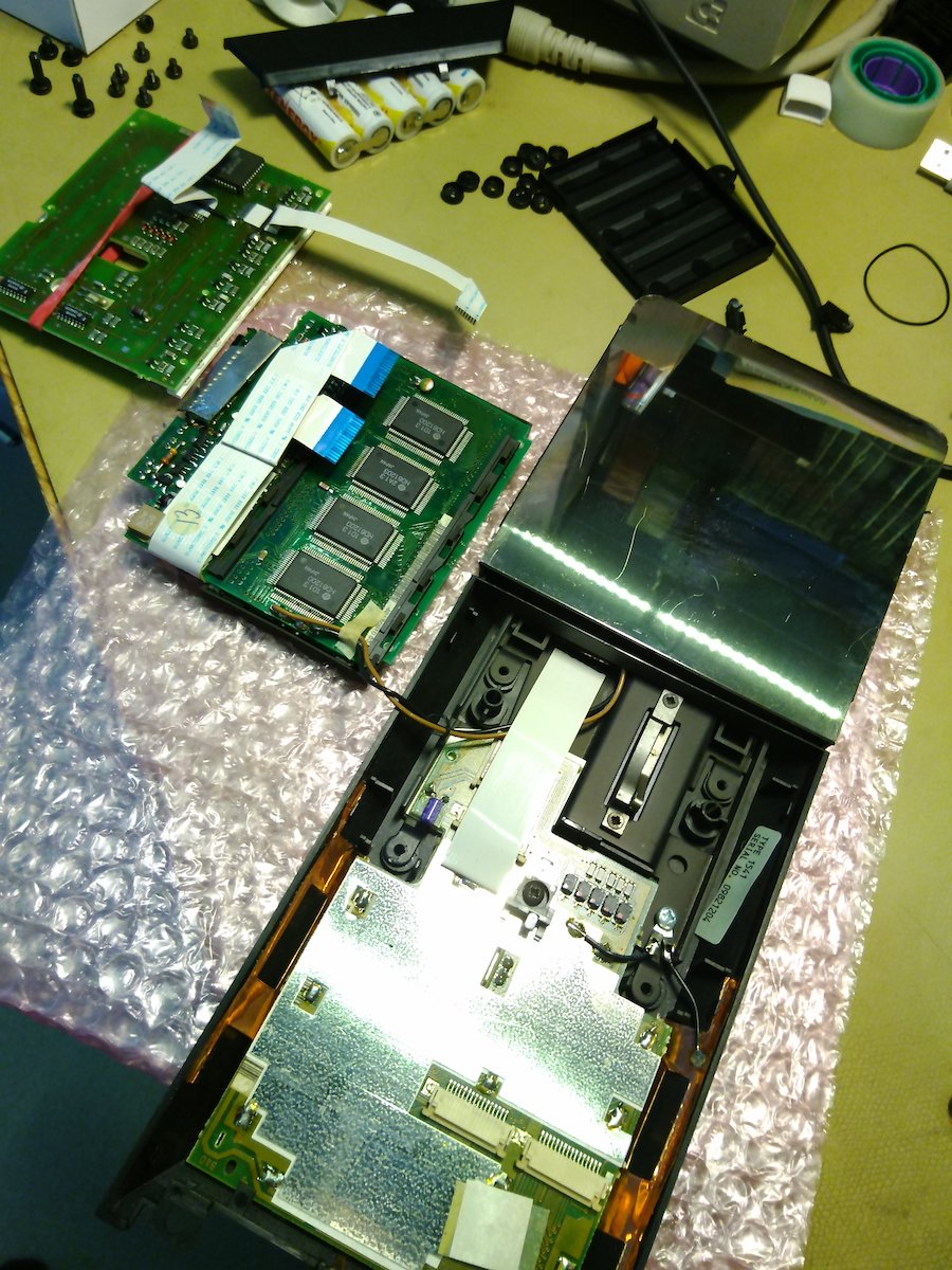 Top left: keyboard PCB, center: display + IR board. Still in the chassis: the CPU board with the battery on the underside of the corner with the white tape.
