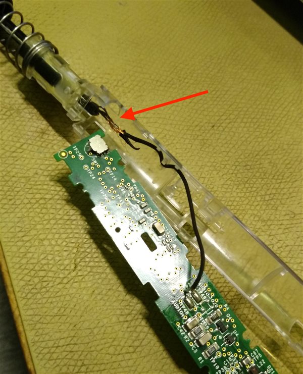 This is how the cable goes inside the unit. The bent is where the cable gets stressed everytime the alarm on/off button is slided. In the picture above the buttons is pressed in (ie. alarm off position).