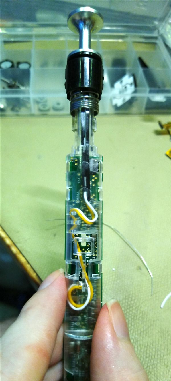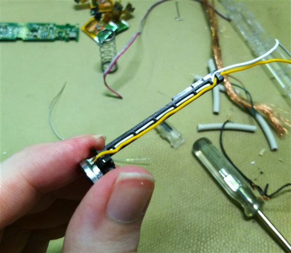 I couldn't find a good replacement, so I just jammed a two-wire solution to the place of the old cable. It kinda fits (I'll get back to this later...), and I just wanted to try if this would work. This is the sliding part that goes inside a square tunnel, so the yellow wire should stay in place, even if it's not all the way held by the small clips at the center.