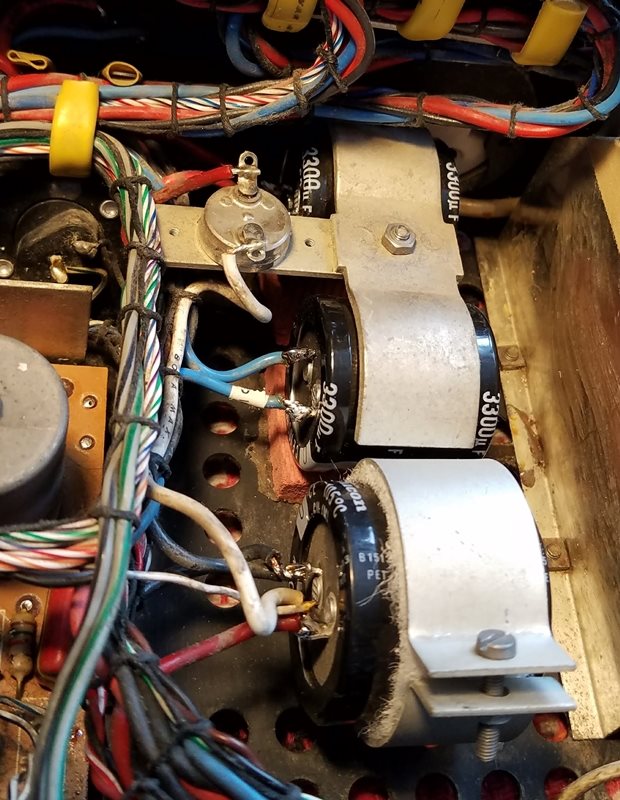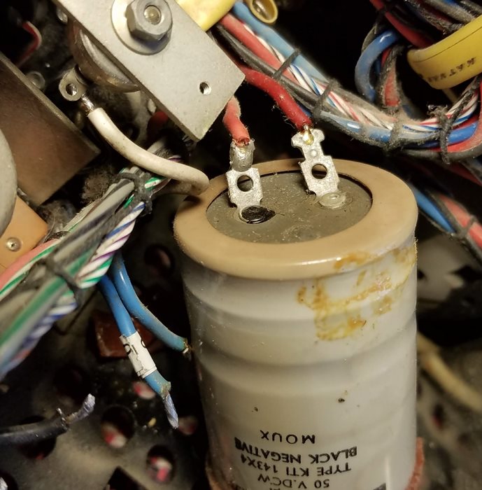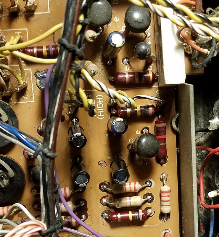I changed the leaking caps and bridged the switch, powered up with my variac observing the 80 V supply, going slowly to 130 V no problems except for the failing lamps, checked the idle currents, no adjustment needed, connected speakers and my phone playing spotify, to phono (set to high) then tape and last aux, all playing good, but with some small distortion.