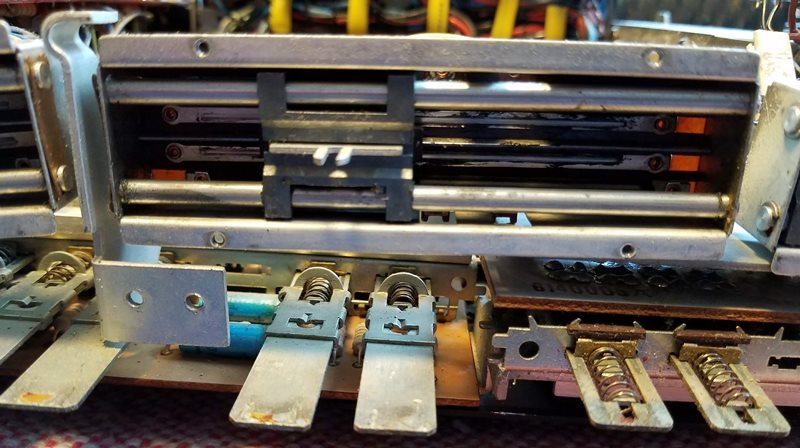 If any one has an idea of how to fix the main switch please tell me, the switch riveted to the fiber board is broken inside and someone used excessive force trying to turn it on and broke the fiberboard, the fiber board is attached to a steel switch support carrying 4 switches, each secured with 4 bend steel pegs, 1 of these is broken so someone was in there trying to repair and gave up on it. As the mechanical part of of the switch assembly is working I am thinking of fitting a micro switch to the switch support, but to do that I will have to dismantle the whole chassis front to get at it, (still thinking about it)