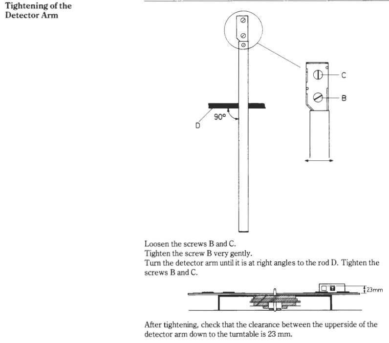 The platter deck to fixed arm top distance should be 23mm. The adjustment for that is the third screw in that service manual picture you included. I guess it should be called "A"