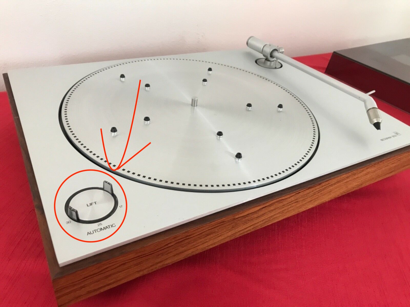 For fine tuning of the speed there is a adjust wheel on the left side of the Beogram 1203: