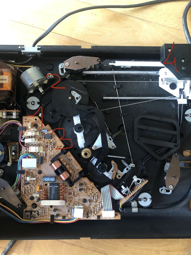 j'ai récemment ouvert ma BEOGRAM 9500 et j'ai fait l'erreur de bouger le bras ainsi que les engrenage et je n'arrive plus à positionner correctement tout ça ensemble. J'ai notamment bouger l'engrenage 1 (voir photo) indépendamment des autres engrenage. J'aimerais avoir une méthode pour tout remettre chaque engrenage correctement avec le bon alignement de chaque dent. Merci d'avance.