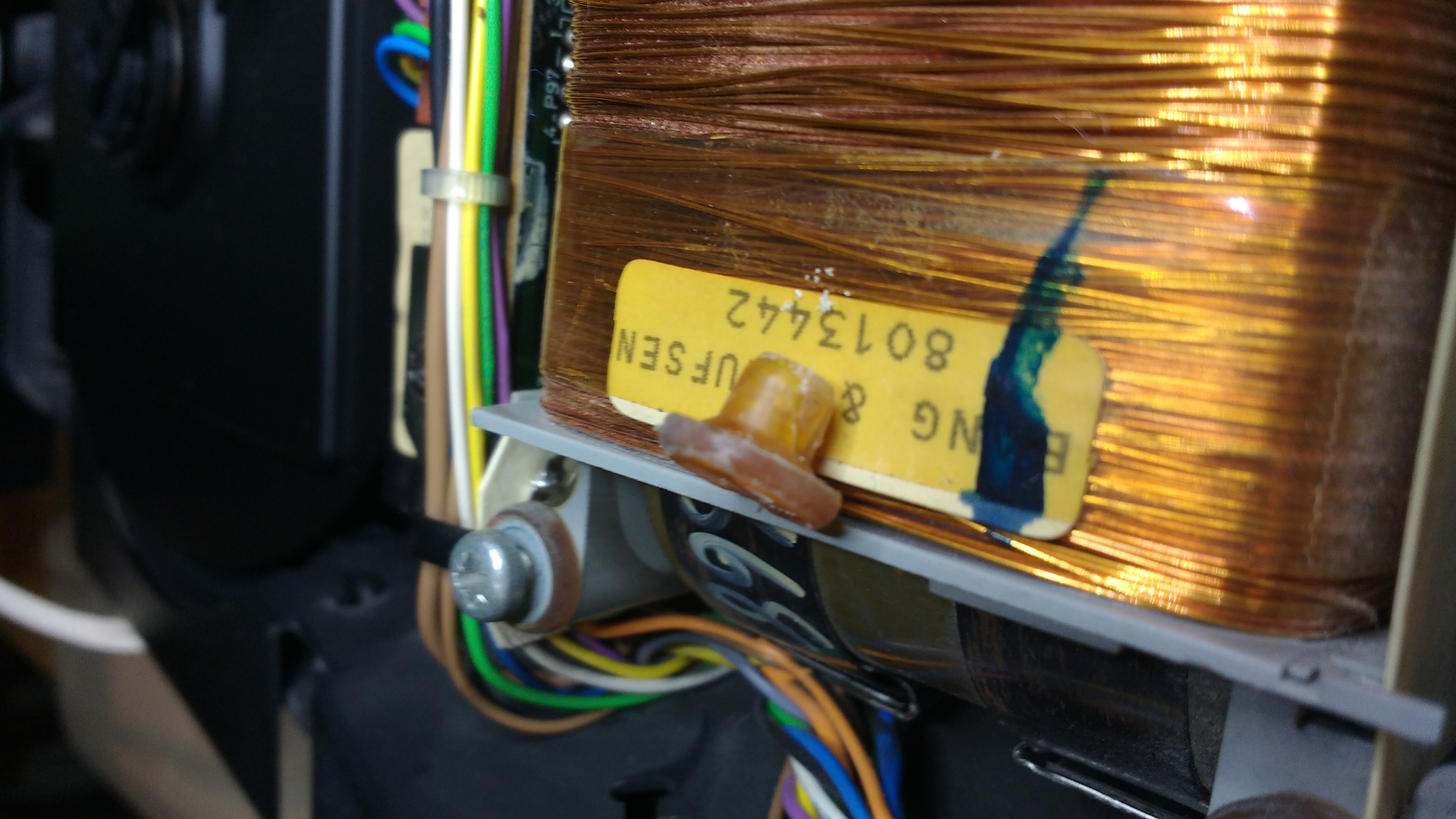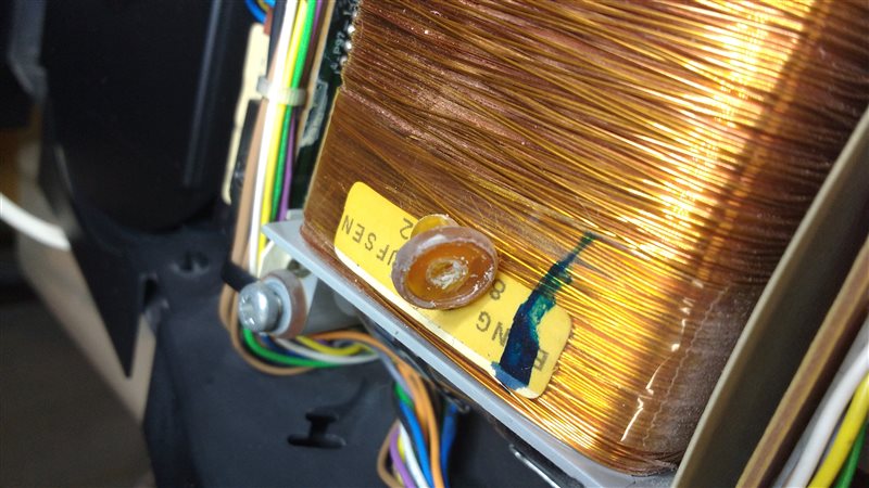 I think I have now also found the reason for the humming noise of the transformer. The bushing which should isolate the transfomer to the fix screws look very bad and are not elastic any more. See pictures below.