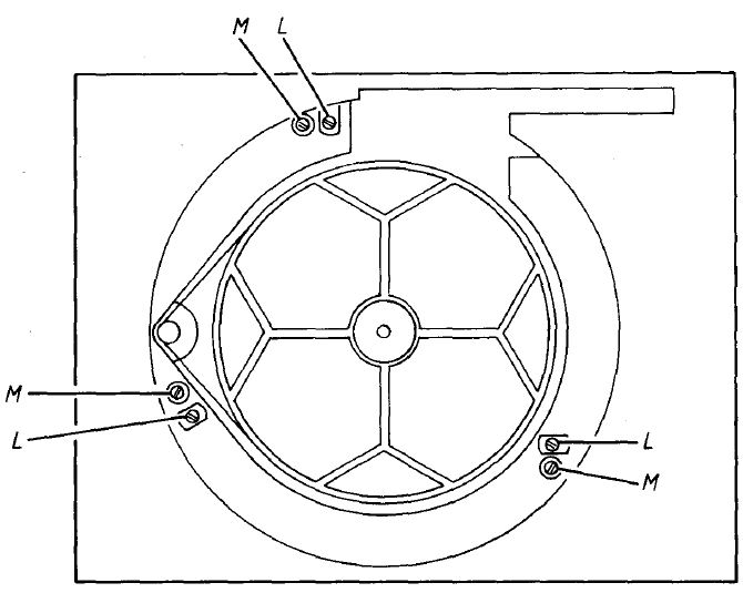 So using the adjustments screws the mechanism was once again centered in relation to the top plate and this is how it looks according to the service manual. Adjusting screws L adjust the distance from the top plate to the topside and loosening the screws M and turning the suspension springs, the drive mechanism is centered in relation to the top plate.