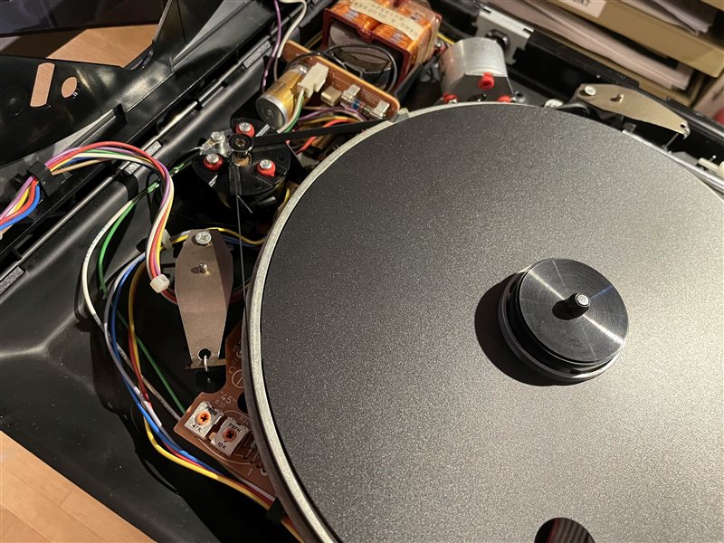 Record rubbing wasn't the issue here on my side, so once again diving into the service manual, to see if there was any hints - not really. But, I then noticed that the aluminium plate wasn't proper centered and the top plat to the topside of the turnable wasn't the even recommended 2.5 - 3.0 mm. While it might not be that easy to see, but if you look at 4 and 8 o'clock on the plate you'll notice that the gap isn't even: