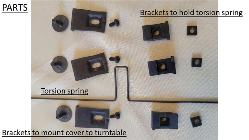 My cover does not seem to have any "friction plates" as mentioned. But I created these three images to show what parts I have, and to show how I believe 1) everything is supposed to be set up; 2) when the tension spring is torqued (top closed), and un-torqued (top open), and 3) which way the curve end on the spring should be pointing (so that the curve is in the groove on the dust cover, and the end is facing away from the dust cover (into the the black hinge bracket when closed). Could you please verify and correct my assumptions as needed. As far as parts, the spring holders go in to hold the spring in place, and the hinge brackets go in to hold the black hinge bracket to the turntable (attached once the dust cover is attached to the hinge bracket with the spring torqued and in place).