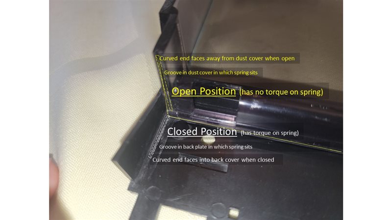 The spring has small curves at the ends, that needs to run in the grooves at the ends of the dustcover, so make sure the spring is the right way up, or it will run with the sharp pointed ends in the grooves and damage the grooves.