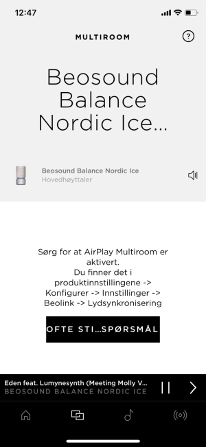 Although this bit is a little confusing when I start with AirPlay, then I use what I think is BeoLink Multiroom in the B&O app, but I also get a warning about having to enable AirPlay Multiroom. Which I can do for the Beosound 1, following the "backend" configuration pages, but I do not have anything similar for the Balance (ref. screenshot in a previous post of mine), even if the app insists I should go to something like Product settings > Configure > Settings > and activate AirPlay multiroom (for the Balance).