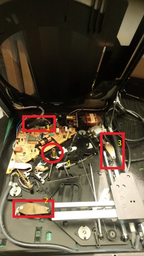 Nu heb ik dat geprobeerd af te stellen vlg de specs uit de service manual. Dat gaat helaas niet omdat de achterzijde een min. hoogte kent (kan dus niet lager) waarbij het draaiplateau aan de achterzijde (3) hoger ligt dan aan de voorzijde op de minimum stand (1+2). Stel je de voorzijde op de desbetreffende 2 punten ook op gelijke hoogte in, dan draait het plateau vrij en goed afgesteld tov de behuizing (vlg spec) maar loopt de tracking arm vast in de bovenzijde vh huis. Inmiddels heb ik de lineariteit van de tracking as, parallelliteit vd tracking arm en hoogte tov het chassis ook gecontroleerd en waar mogelijk afgesteld maar dit biedt geen oplossing. Wel het laten zakken van het subchassis (incl vliegwiel en draaiplateau). Dan loopt de tracking arm weer vrij. Echter ligt het plateau dan weer scheef (tov de behuizing).