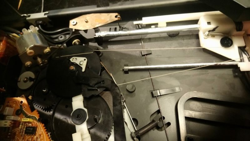 Mijn Beogram 5500 geeft al al sinds "aankoop" af en toe slepende geluiden (niet te traceren). Net voor de Kerst wilde de tangentiaal arm niet meer naar de startpositie terugkeren na een knappend geluid. Inmiddels wat service delen besteld waaronder snaren. Inmiddels begonnen. Bij een eerste controle bleken alle snaren en servo's nog heel. Het koord dat de tangentiaal arm aandrijft was echter losgeschoten van de veer. Bevestigingsoog vd veer was verbogen. Na >1 uur gepiel met de service manual ernaast is het uiteindelijk gelukt om deze functie te herstellen. Koord was gelukkig niet geknapt. Wel gaf de arm een ratelend/knappend geluid bij terugkomst in de startpositie. Na het afstellen op 17 en 30 cm startpositie was dit geluid gelukkig weg. Waarom het koord losgeschoten is, blijft totaal onduidelijk. Alles loopt na schoonmaken en smeren erg soepel.