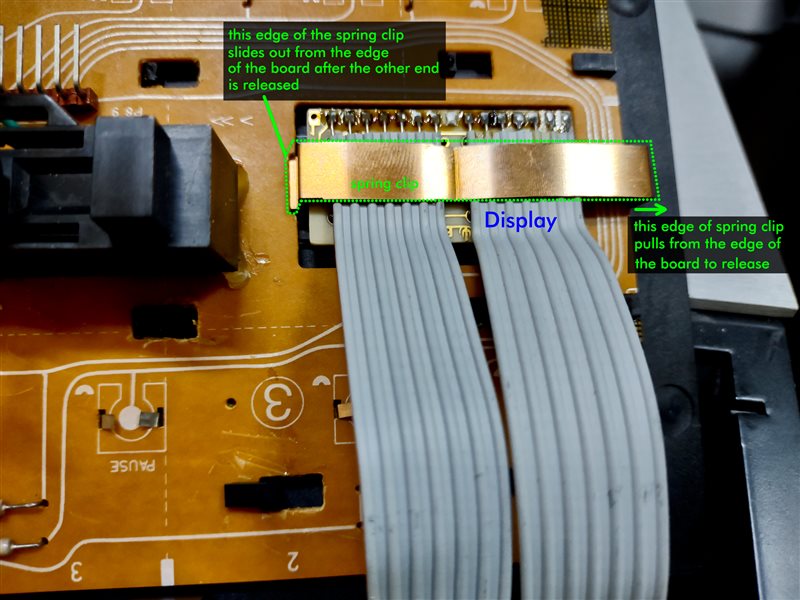 Sometimes you have to first bend the ribbon cable of the LED display assembly so that it isn't fighting you trying to position the holding clip.Often it wins the battle and as you are trying to fit the control panel back into the cabinet the LED display comes away from the panel as the clip falls out.A bit of frustrating there but eventually you get the hang of securing it.