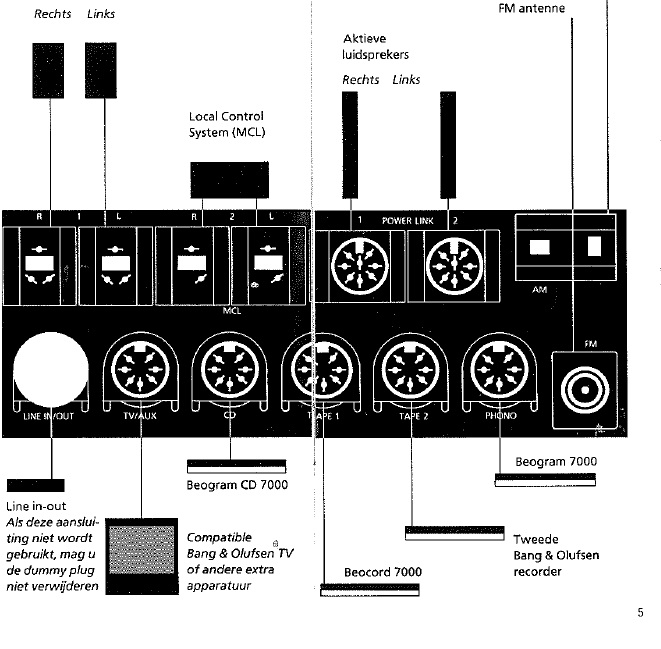 Ik wil een extern apparaat aansluiten op een beomaster 7000. Deze heeft line signaal uitgang. Ik wil de tape2 ingang gebruiken. Ik weet alleen niet welke pennen van de din7 plug de line ingangen zijn.