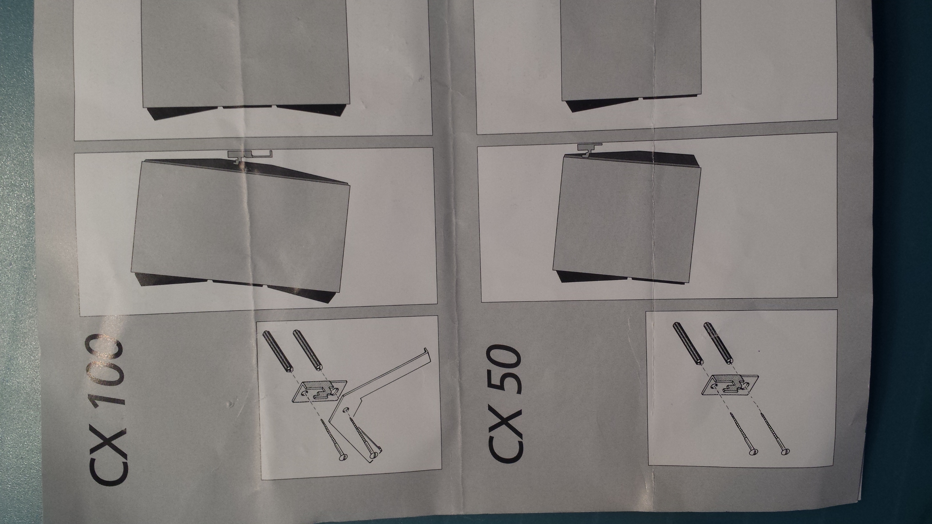 Het kleine beugeltje wordt aan de muur gemonteerd, bij een CX100 wordt de onderste beugel met gemonteerd aan de onderkant van het kleine beugeltje, wordt dus met schroef door het onderste gat van het kleine beugeltje in de muur geschroefd. De driehoekige beugel zorgt ervoor dat de CX100 recht aan de muur komt te hangen en niet voorover hangt.