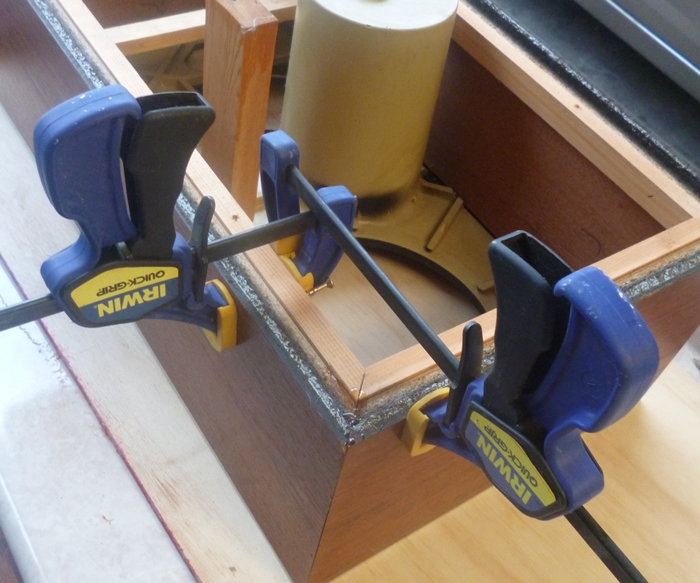 I have no corner clamp, so 2 normal clamps would have to do, not the best solution but it works, I snapped a bottle of Gorilla wood glue last time I was shopping, turned out to be some expanding sort of glue foam, but it worked.