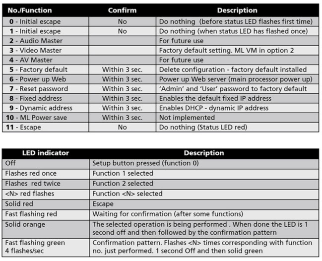 function has been reached. The number of times the LED flashes red is corresponding to the actual function. When the setup button is released and the LED starts flashing red, the setup button must be pressed once within 3 seconds to confirm the function. Some functions do not require confirmation. The LED will change to orange to indicated that the selected function is being carried out. The LED goes off for one second, then the LED flashes green <N> times corresponding with the function number just performed and at last the LED goes off (normal operation).