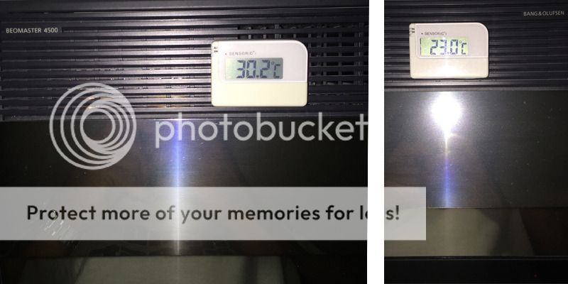 When i got home i put two termometers on my Bombaster when in standby. It differs 7 Celcius between the area above the transistors (i guess) and the other end of the amp! How bad is this?! Should i try to return it? The tape and Cd isen't even close to getting this warm but I still think there's a small temp. difference between the left and the right side.