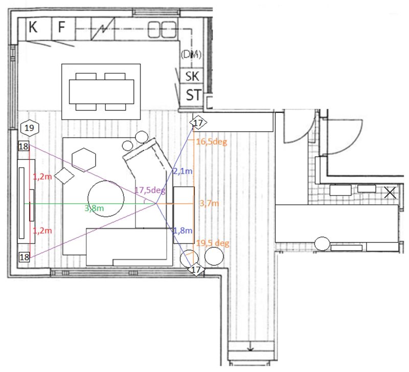 Also I'm wondering how to place the speakers in my apartment, see picture. Right now I have the sofa 3,8 meters (12,5 feet from the television) from the speakers. Feedback?