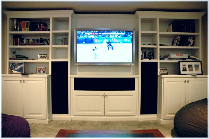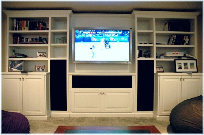 6. Assuming I can get these working well again, the intention is to have a custom made bookshelf installed in my ‘listening room’. I know these are designed to be hung on the wall, but I’m thinking about basically building them into the shelves. How would this best be done? Are they really best hung or are they just as good sitting on a shelf at the appropriate height? I assume they’ll need to sit at the front of the shelf, probably with the grills sitting proud. Should I put a false back behind them so the is no space behind? I’ve included a photo similar to what I have in mind, but with the speakers set higher.