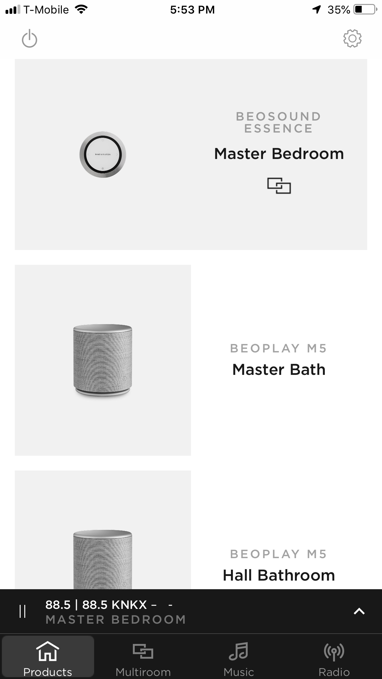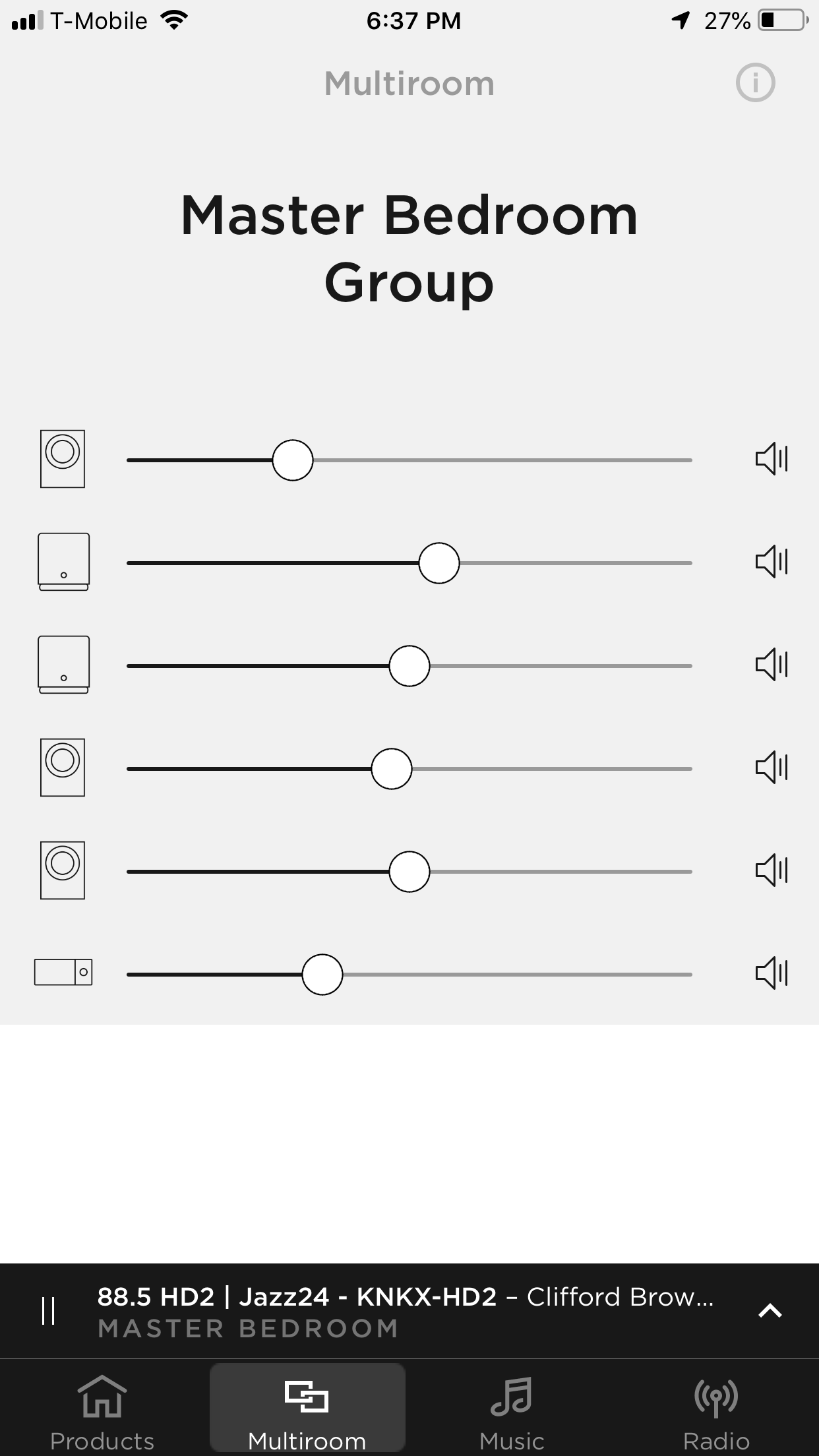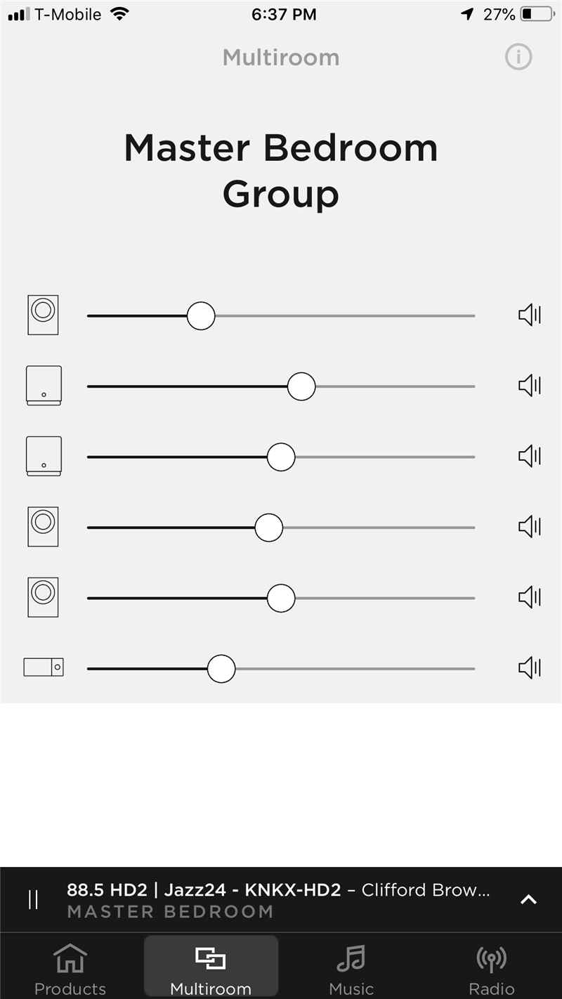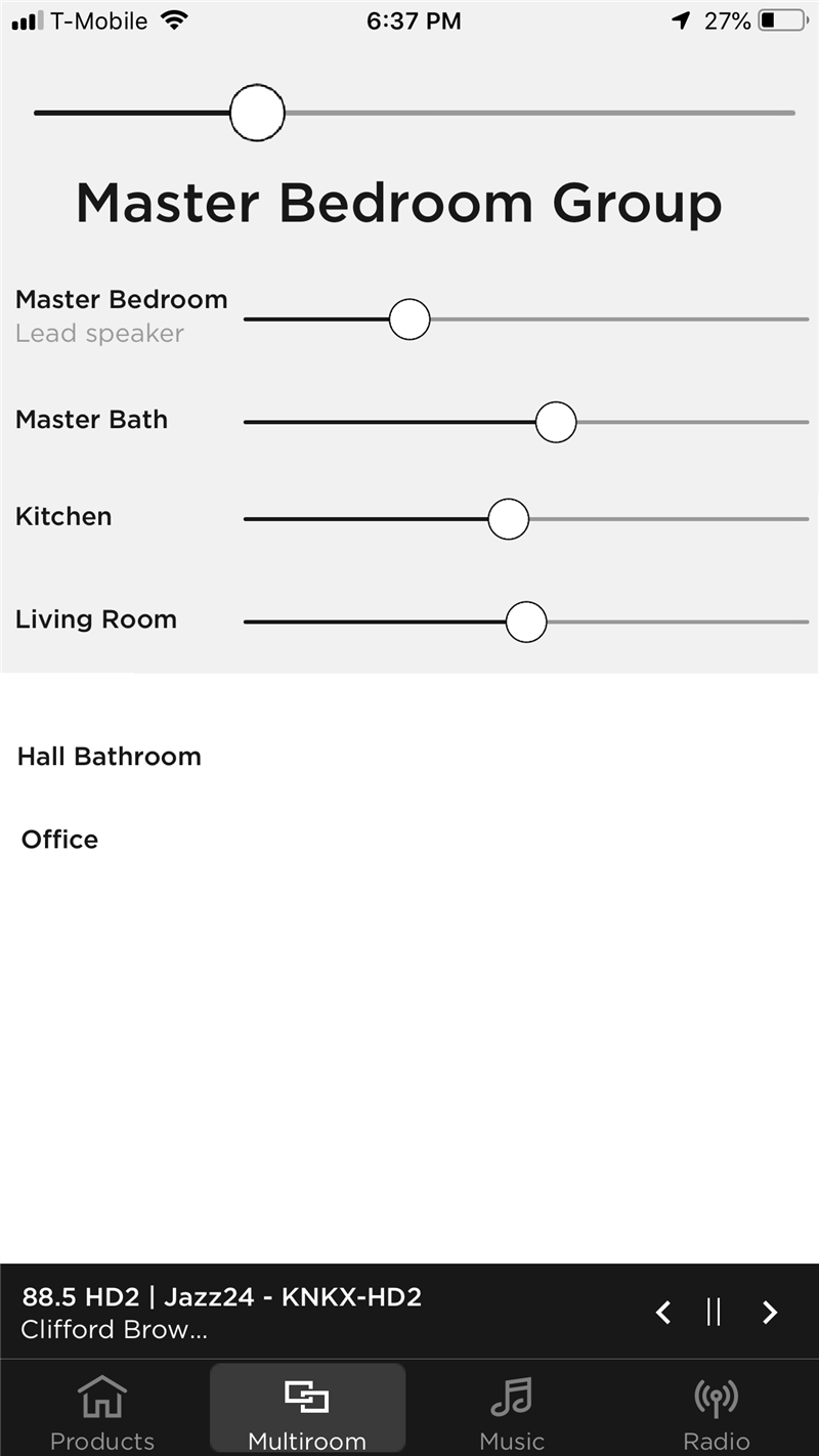 And why do I have to choose to either see what my products are or be able to change their volume? All the the icons on each product row waste space and therefore add extra steps for control. And "Multiroom" and "Master Bedroom" both appear at the top of the page and again at the bottom of the page, eating up valuable screen space with redundant information.