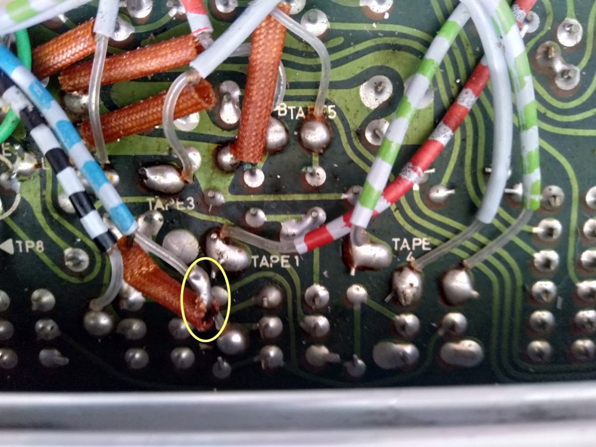 All the level LED's are permanently on. I have adjusted the slider and even removed the top transport board with no difference. I have noticed on the Radio board, a wire which seems to be off. looks like it should be grounded somewhere in this area marked Tape. see picture.