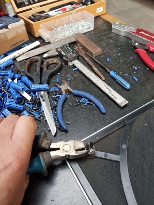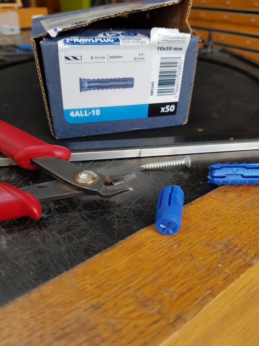 I went through various solutions of spacers and solid pins, and couldn’t find any clips on the market that would flex in like the originals (which was actually quite a neat design… until things got snappy) and still be allowed to come out whilst at the same time still holding firm enough. Once I’d decided on my solution I trialed various 10mm Rawl Plugs. Using plugs the intended way around made them splay out and I couldn’t get consistency and I didn’t think gluing them on was going to be a permanent enough solution. The final choice was made for these particular ones due to their flat, solid top construction, where most wall plugs are rounded and split at the top or just joined at the top with a thin plastic thread. They even already have a crosscut in the top that just happened to accept the screw.