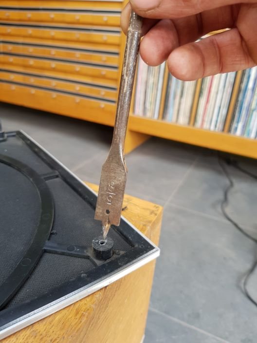 Not wanting to risk drilling down through the fabric and table! I used a flat wood drill bit, and with very little pressure by hand in the centre it revealed the existing hole in the centre of the lug, which was very handy to find. Then again by hand with just a few turns it was large enough to accept a screw.