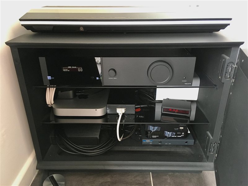 Inside the B&O cabinet, the Lyngdorf (only used for the Room Perfect feature, feeded with USB from the Mac Mini, SPDIF output connected to the DAC of the BL5) on the top, the Mac Mini+Audirvana as source (embedded Tidal for streaming) and all the boxes for Beolink and TV reception, everything controlled with the Beo4 with a Lintronic IR box.