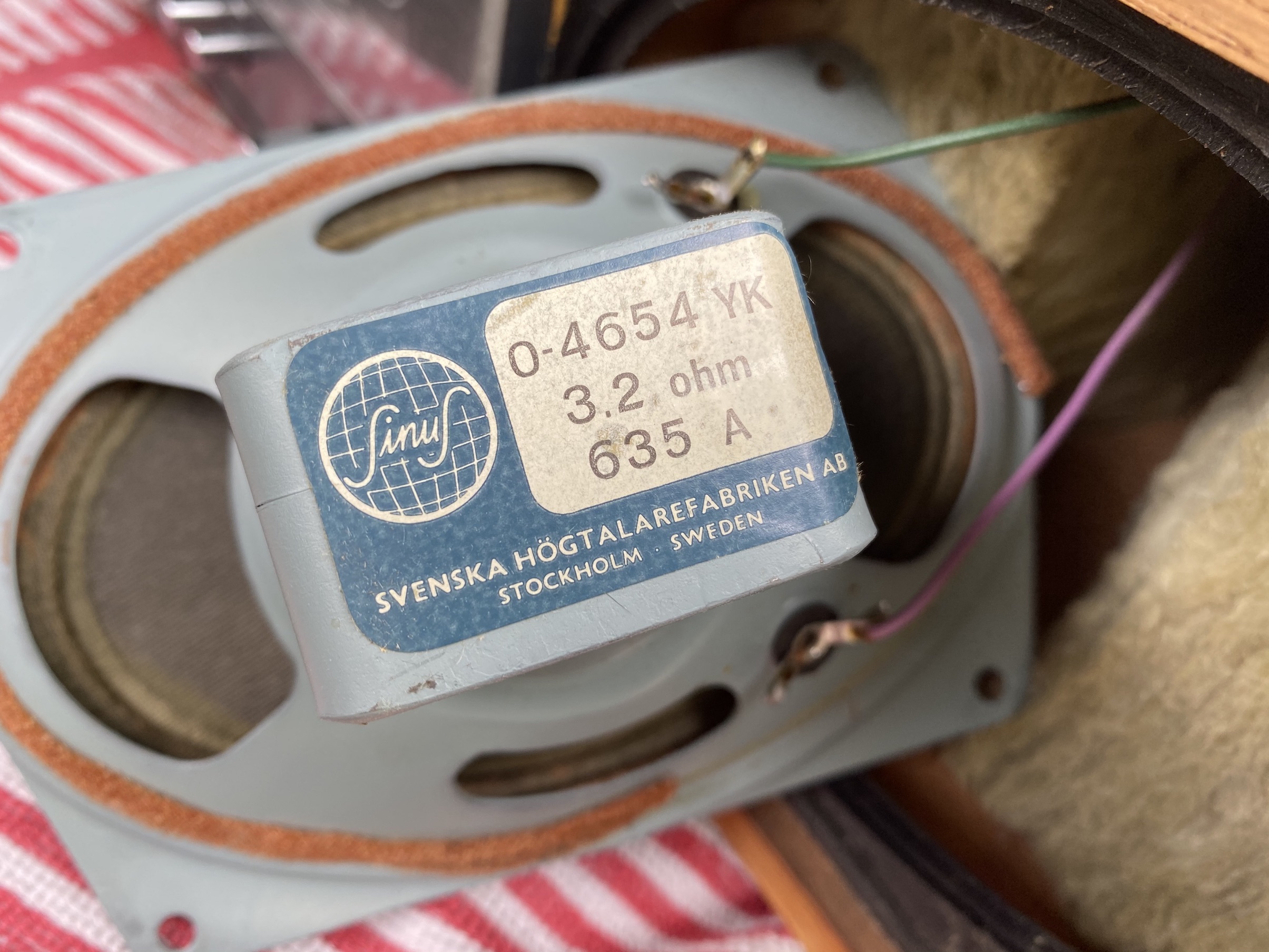 The original speaker is a Sinus/Svenska, 0 4654 YK, 3.2 Ohm, 635 A.