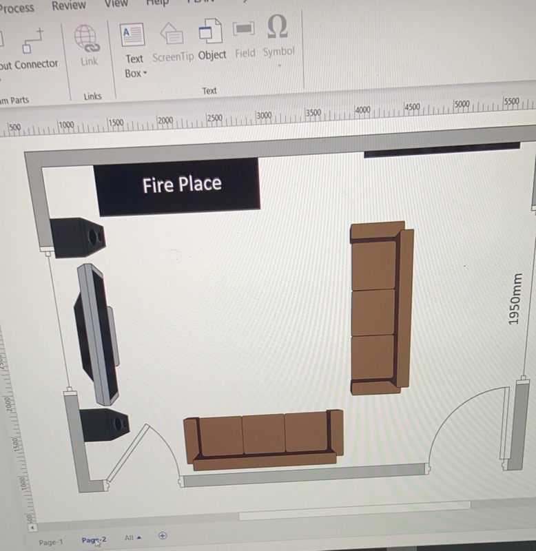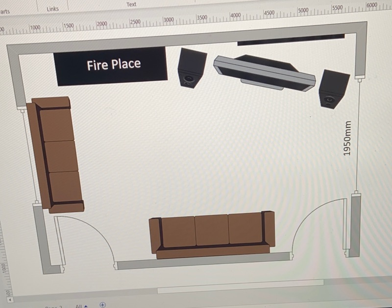 Without looking at this in too much detail my initial thought is to change the position of the right hand sofa with the tv and BL5s as shown in Option 1. This is a nicer setup with a good sense of space around all the objects in the room including fireplace, radiators, doors, tv, sofas etc. However, since the tv and speakers would now be in the middle right of the room, you’d need to consider how to cable it all in. The easiest way would be with a large rug that goes up to the walls and then hide the cables under that. Not necessarily the best solution but the easiest workable without too much extra work.