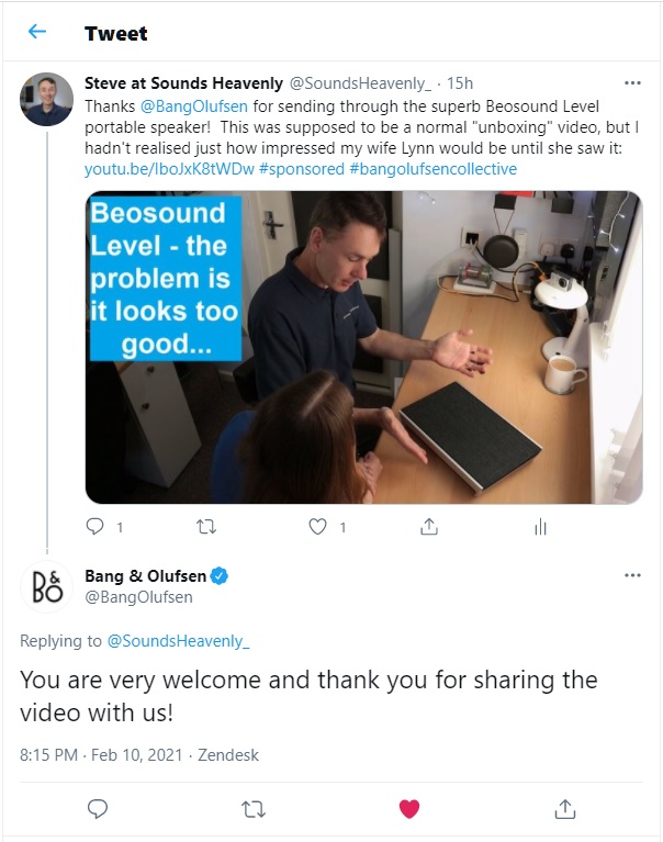 Really happy to get a tweet from Bang and Olufsen about my Beosound Level video!