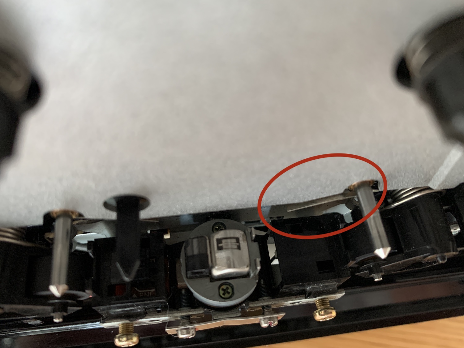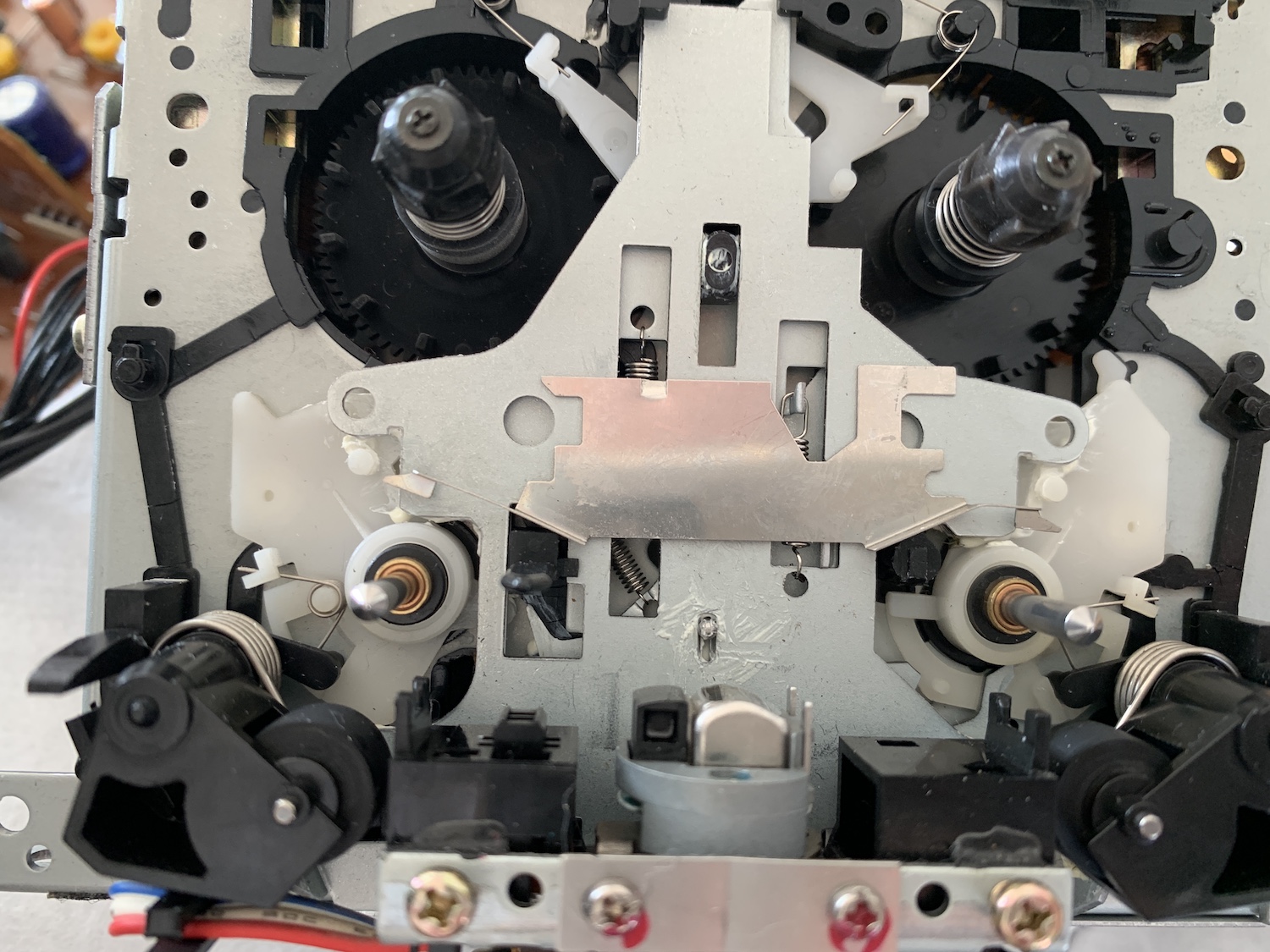 The metal plates two arms should rest on the forward edge of the capstan bearings - not on the capstan spindles.The plate holder has broken at the right side, you will have to glue it back onto the black plastic as good as you can.