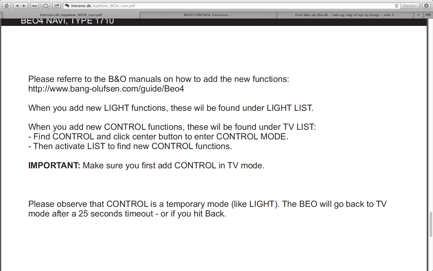 When you have added CONTROL to BEO4 LIST, press LIST until CONTROL appears, press SELECT (center button), press LIST again.